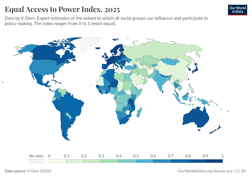“Data Page: Equal access to power index”, part of the following publication: Bastian Herre, Lucas Rodés-Guirao, and Esteban Ortiz-Ospina (2013) - “Democracy”. Data adapted from V-Dem. Retrieved from https://who-mortality-db.owid.pages.dev:8789/20260304-094028/grapher/equal-access-to-power-index.html [online resource] (archived on March 4, 2026).How to cite this data