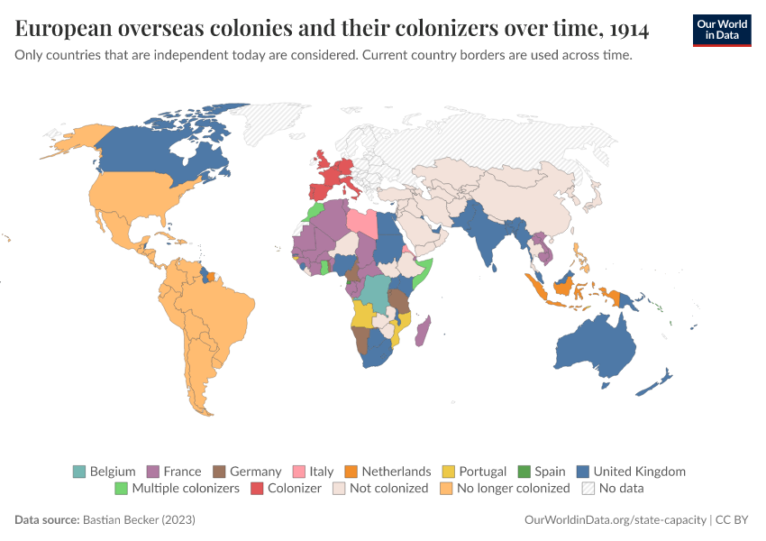 “Data Page: European overseas colonies and their colonizers over time”, part of the following publication: Bastian Herre and Pablo Arriagada (2023) - “State Capacity”. Data adapted from Bastian Becker. Retrieved from https://who-mortality-db.owid.pages.dev:8789/20260304-094028/grapher/european-overseas-colonies-and-their-colonizers.html [online resource] (archived on March 4, 2026).How to cite this data