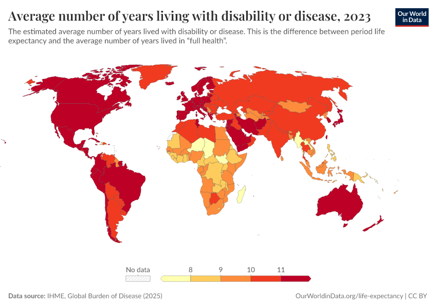 “Data Page: Average number of years living with disability or disease”, part of the following publication: Saloni Dattani, Lucas Rodés-Guirao, Hannah Ritchie, Esteban Ortiz-Ospina, and Max Roser (2023) - “Life Expectancy”. Data adapted from IHME, Global Burden of Disease. Retrieved from https://who-mortality-db.owid.pages.dev:8789/20260304-094028/grapher/expected-years-of-living-with-disability-or-disease-burden.html [online resource] (archived on March 4, 2026).How to cite this data