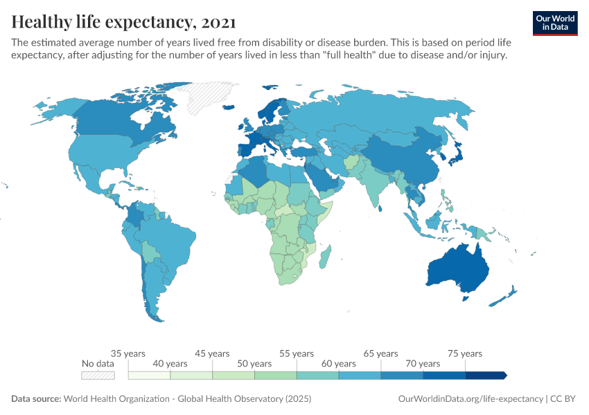 “Data Page: Healthy life expectancy”. Our World in Data (2026). Data adapted from World Health Organization. Retrieved from https://who-mortality-db.owid.pages.dev:8789/20260304-094028/grapher/healthy-life-expectancy-at-birth.html [online resource] (archived on March 4, 2026).How to cite this data