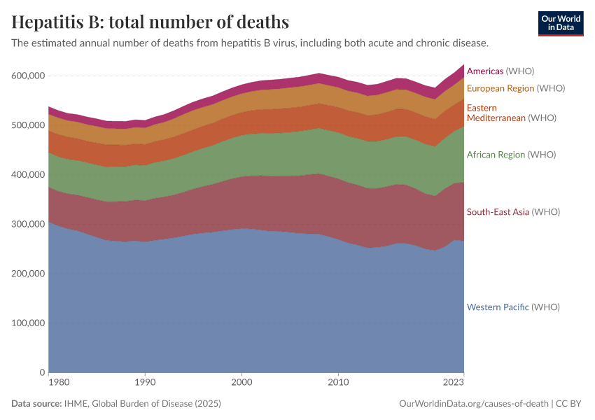IHME, Global Burden of Disease (2025) – with major processing by Our World in Data. “Hepatitis B: total number of deaths” [dataset]. IHME, Global Burden of Disease, “Global Burden of Disease - Deaths” [original data]. Retrieved March 12, 2026 from https://who-mortality-db.owid.pages.dev:8789/20260304-094028/grapher/hepatitis-b-number-of-deaths.html (archived on March 4, 2026).