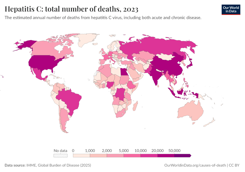 “Data Page: Hepatitis C: total number of deaths”, part of the following publication: Esteban Ortiz-Ospina and Max Roser (2016) - “Global Health”. Data adapted from IHME, Global Burden of Disease. Retrieved from https://who-mortality-db.owid.pages.dev:8789/20260304-094028/grapher/hepatitis-c-number-of-deaths.html [online resource] (archived on March 4, 2026).How to cite this data
