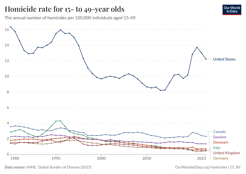 IHME, Global Burden of Disease (2025) – with major processing by Our World in Data. “Homicide rate for 15- to 49-year olds” [dataset]. IHME, Global Burden of Disease, “Global Burden of Disease - Deaths” [original data]. Retrieved March 12, 2026 from https://who-mortality-db.owid.pages.dev:8789/20260304-094028/grapher/homicide-rate-in-15--to-49-year-olds.html (archived on March 4, 2026).
