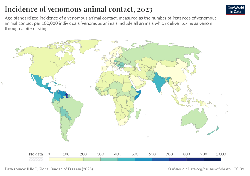 IHME, Global Burden of Disease (2025) – with major processing by Our World in Data. “Incidence of venomous animal contact” [dataset]. IHME, Global Burden of Disease, “Global Burden of Disease - Prevalence and Incidence” [original data]. Retrieved March 12, 2026 from https://who-mortality-db.owid.pages.dev:8789/20260304-094028/grapher/incidence-of-venomous-animal-contact.html (archived on March 4, 2026).