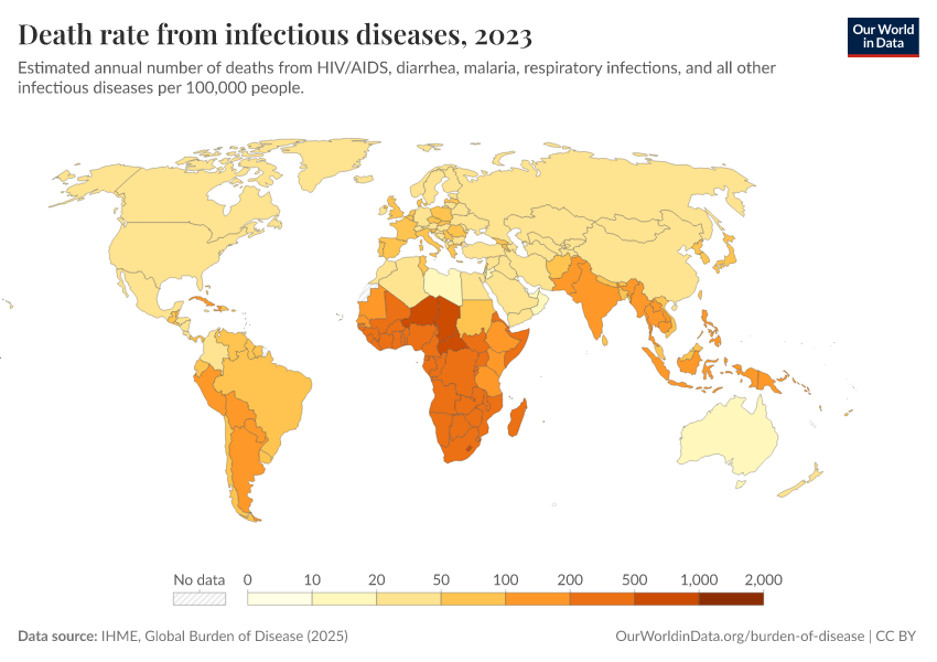 IHME, Global Burden of Disease (2025) – with major processing by Our World in Data. “Death rate from infectious diseases” [dataset]. IHME, Global Burden of Disease, “Global Burden of Disease - Deaths” [original data]. Retrieved March 12, 2026 from https://who-mortality-db.owid.pages.dev:8789/20260304-094028/grapher/infectious-disease-death-rates-gbd.html (archived on March 4, 2026).