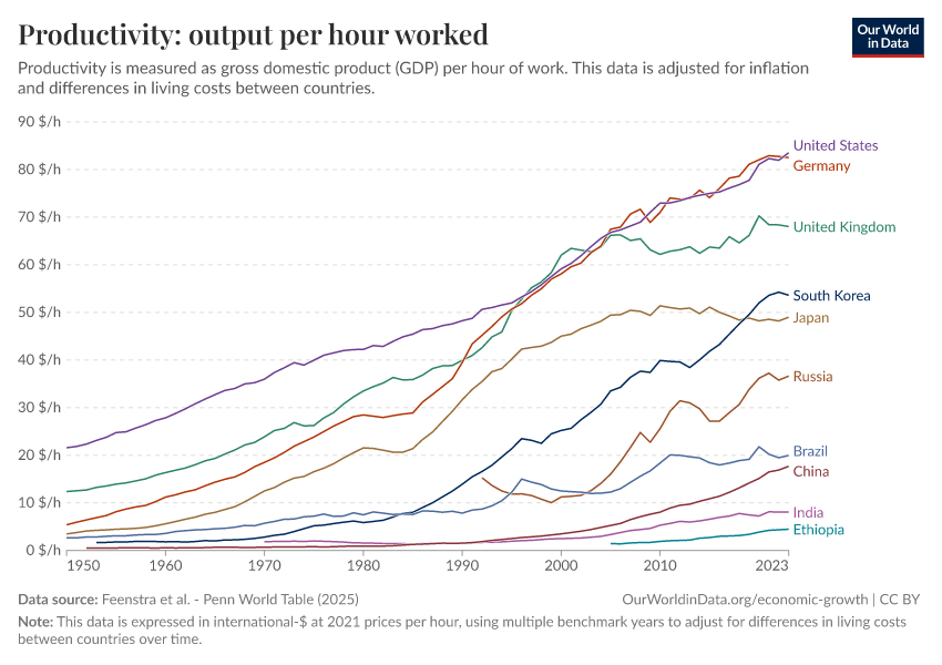 Feenstra et al. - Penn World Table (2025) – with major processing by Our World in Data. “Productivity: output per hour worked – Penn World Table – In constant international-$” [dataset]. Feenstra et al., “Penn World Table 11.0” [original data]. Retrieved March 12, 2026 from https://who-mortality-db.owid.pages.dev:8789/20260304-094028/grapher/labor-productivity-per-hour-pennworldtable.html (archived on March 4, 2026).
