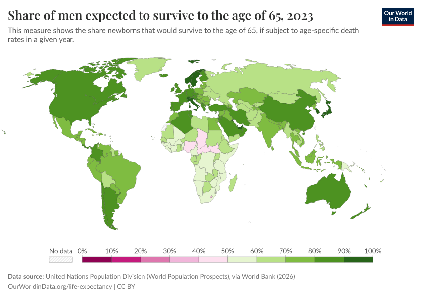 “Data Page: Share of men expected to survive to the age of 65”. Our World in Data (2026). Data adapted from United Nations Population Division (World Population Prospects), via World Bank. Retrieved from https://who-mortality-db.owid.pages.dev:8789/20260304-094028/grapher/men-survival-to-age-65.html [online resource] (archived on March 4, 2026).How to cite this data
