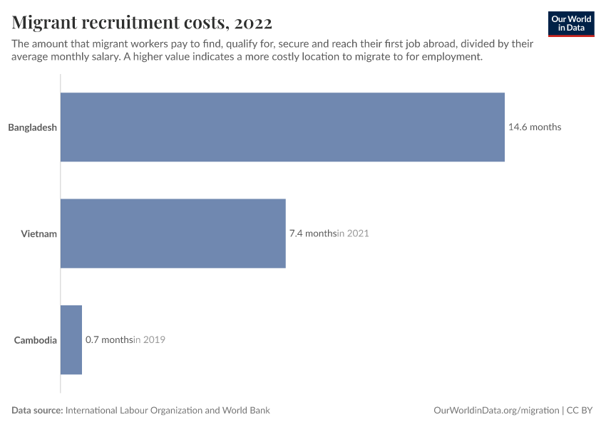 “Data Page: Migrant recruitment costs”. Our World in Data (2026). Data adapted from International Labour Organization and World Bank. Retrieved from https://who-mortality-db.owid.pages.dev:8789/20260304-094028/grapher/migrant-recruitment-costs.html [online resource] (archived on March 4, 2026).How to cite this data