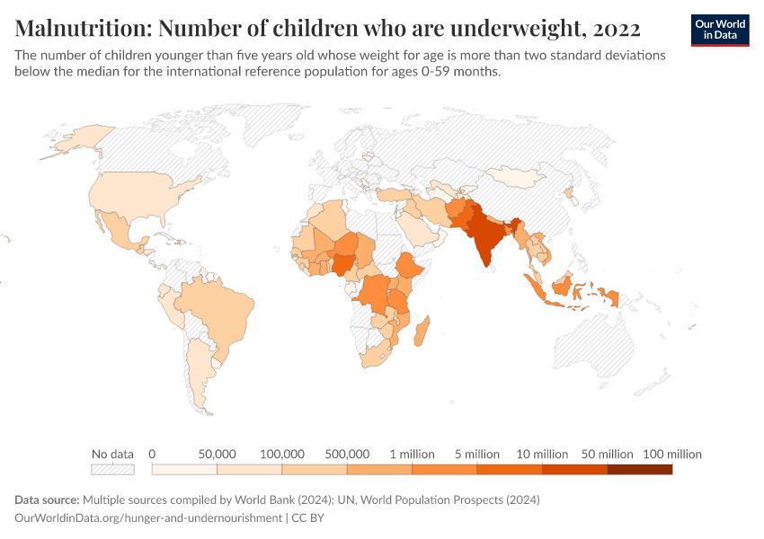 “Data Page: Number of underweight children”. Our World in Data (2026). Data adapted from UNICEF, WHO, World Bank, United Nations. Retrieved from https://who-mortality-db.owid.pages.dev:8789/20260304-094028/grapher/number-of-children-who-are-underweight.html [online resource] (archived on March 4, 2026).How to cite this data
