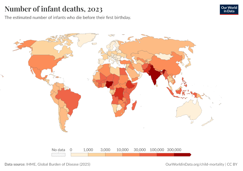 IHME, Global Burden of Disease (2025) – with minor processing by Our World in Data. “Number of infant deaths” [dataset]. IHME, Global Burden of Disease, “Global Burden of Disease - Child Mortality” [original data]. Retrieved March 12, 2026 from https://who-mortality-db.owid.pages.dev:8789/20260304-094028/grapher/number-of-infant-deaths-ihme.html (archived on March 4, 2026).