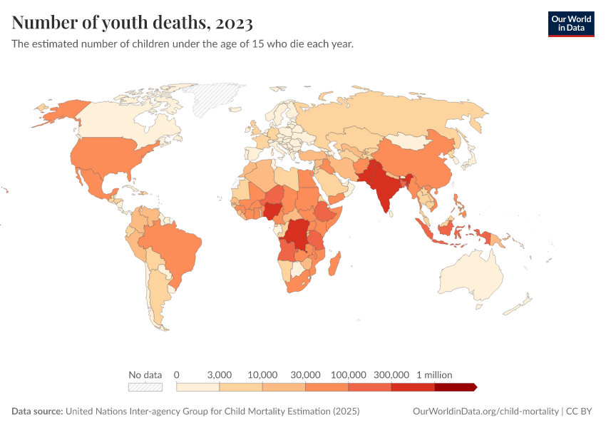 United Nations Inter-agency Group for Child Mortality Estimation (2025) – with minor processing by Our World in Data. “Under-fifteen deaths” [dataset]. United Nations Inter-agency Group for Child Mortality Estimation, “United Nations Inter-agency Group for Child Mortality Estimation”; UN Inter-agency Group for Child Mortality Estimation, “Child Mortality Estimates 2018”; Various sources, “Population” [original data]. Retrieved March 12, 2026 from https://who-mortality-db.owid.pages.dev:8789/20260304-094028/grapher/number-of-youth-deaths.html (archived on March 4, 2026).