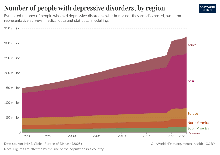 IHME, Global Burden of Disease (2025) – with major processing by Our World in Data. “Number of people with depressive disorders, by region” [dataset]. IHME, Global Burden of Disease, “Global Burden of Disease - Mental Health Prevalence” [original data]. Retrieved March 12, 2026 from https://who-mortality-db.owid.pages.dev:8789/20260304-094028/grapher/number-suffering-from-depression-by-region.html (archived on March 4, 2026).