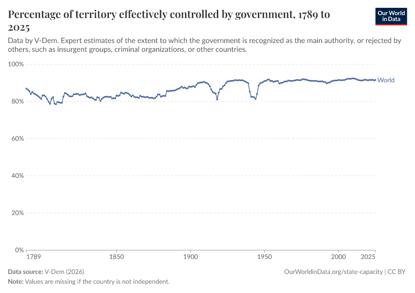 “Data Page: Territory under state control”, part of the following publication: Bastian Herre, Lucas Rodés-Guirao, and Esteban Ortiz-Ospina (2013) - “Democracy”. Data adapted from V-Dem. Retrieved from https://who-mortality-db.owid.pages.dev:8789/20260304-094028/grapher/percentage-of-territory-controlled-by-government.html [online resource] (archived on March 4, 2026).How to cite this data