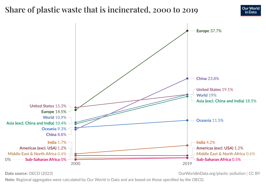 “Data Page: Share of plastic waste that is incinerated”, part of the following publication: Hannah Ritchie, Veronika Samborska, and Max Roser (2023) - “Plastic Pollution”. Data adapted from OECD. Retrieved from https://who-mortality-db.owid.pages.dev:8789/20260304-094028/grapher/plastic-waste-incinerated.html [online resource] (archived on March 4, 2026).How to cite this data