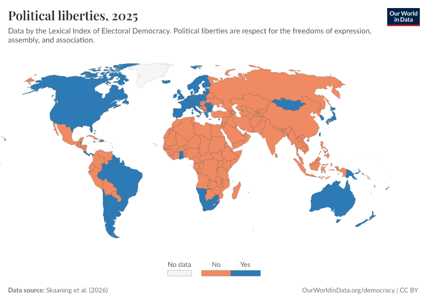 Skaaning et al. (2025) – processed by Our World in Data. “Political liberties” [dataset]. Skaaning et al., “Lexical Index of Electoral Democracy (LIED) v6.8” [original data]. Retrieved March 12, 2026 from https://who-mortality-db.owid.pages.dev:8789/20260304-094028/grapher/political-liberties-lexical.html (archived on March 4, 2026).