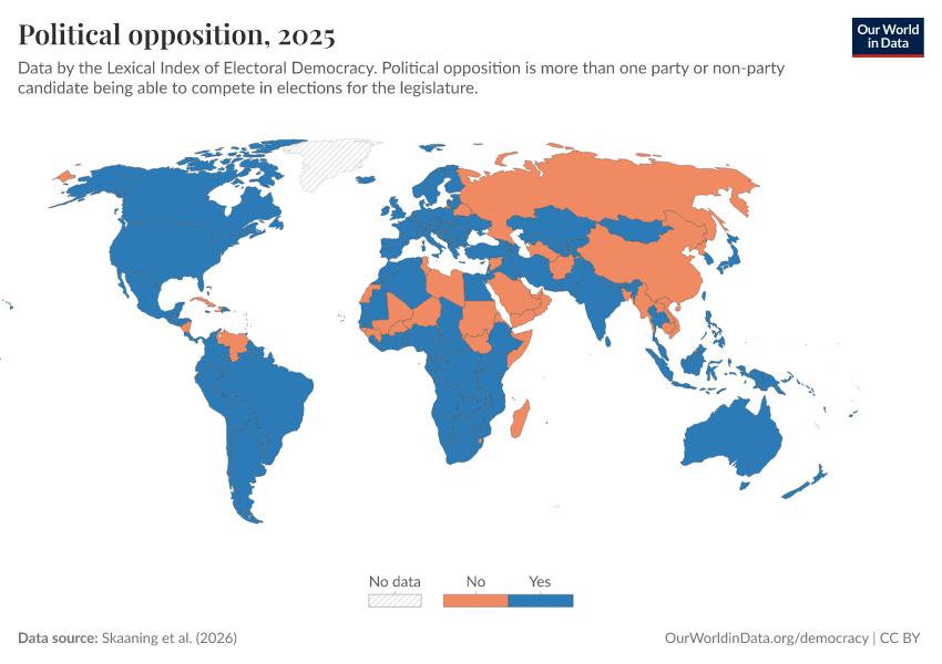 Skaaning et al. (2025) – processed by Our World in Data. “Political opposition” [dataset]. Skaaning et al., “Lexical Index of Electoral Democracy (LIED) v6.8” [original data]. Retrieved March 12, 2026 from https://who-mortality-db.owid.pages.dev:8789/20260304-094028/grapher/political-opposition-lexical.html (archived on March 4, 2026).