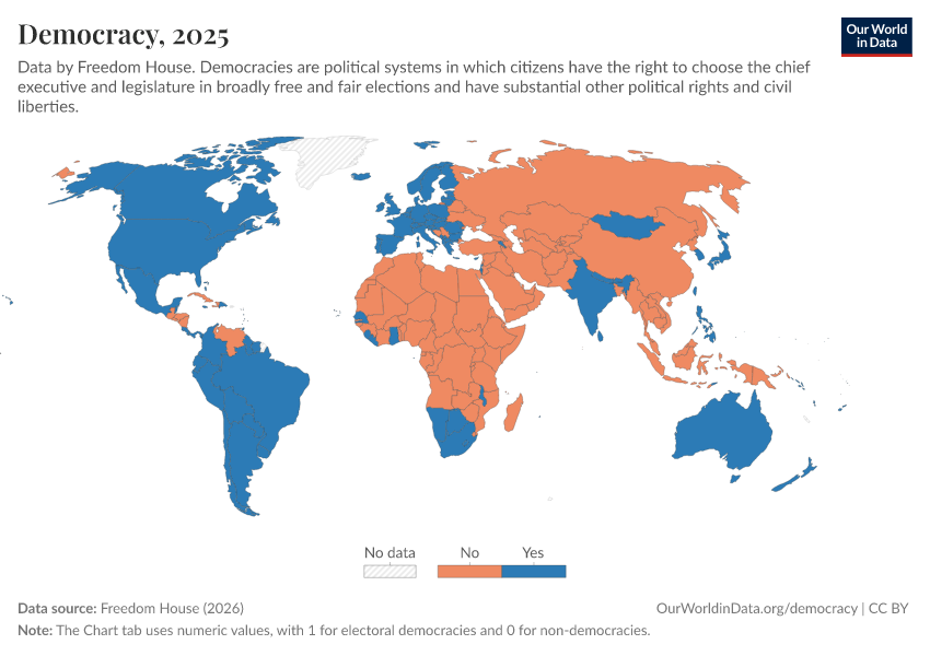 Freedom House (2025) – processed by Our World in Data. “Democracy” [dataset]. Freedom House, “Freedom in the World” [original data]. Retrieved March 12, 2026 from https://who-mortality-db.owid.pages.dev:8789/20260304-094028/grapher/political-regime-dem-fh.html (archived on March 4, 2026).