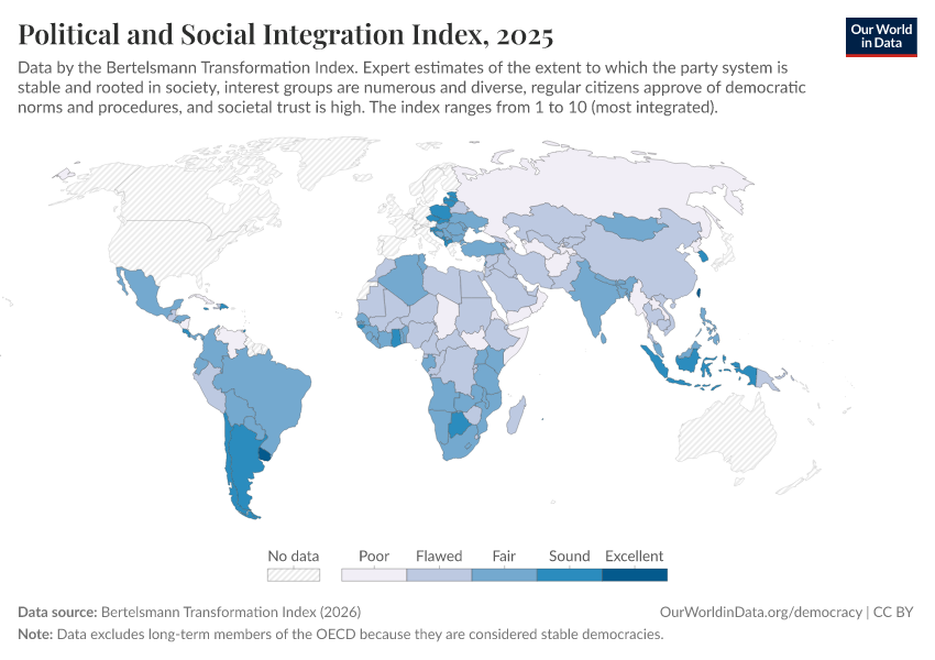 “Data Page: Political and Social Integration Index”, part of the following publication: Bastian Herre, Lucas Rodés-Guirao, and Esteban Ortiz-Ospina (2013) - “Democracy”. Data adapted from Bertelsmann Transformation Index. Retrieved from https://who-mortality-db.owid.pages.dev:8789/20260304-094028/grapher/political-social-integration-index-bti.html [online resource] (archived on March 4, 2026).How to cite this data