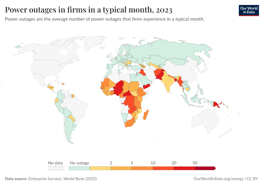 “Data Page: Power outages in firms in a typical month”. Our World in Data (2026). Data adapted from Enterprise Surveys, World Bank. Retrieved from https://who-mortality-db.owid.pages.dev:8789/20260304-094028/grapher/power-outages-in-firms-per-month.html [online resource] (archived on March 4, 2026).