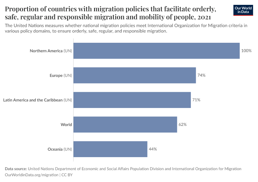 United Nations Department of Economic and Social Affairs Population Division and International Organization for Migration – processed by Our World in Data. “Proportion of countries with migration policies that facilitate orderly, safe, regular and responsible migration and mobility of people” [dataset]. United Nations Department of Economic and Social Affairs Population Division and International Organization for Migration, “Data from multiple sources” [original data]. Retrieved March 12, 2026 from https://who-mortality-db.owid.pages.dev:8789/20260304-094028/grapher/proportion-countries-migration-policies-criteria.html (archived on March 4, 2026).