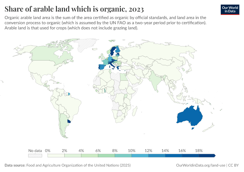 “Data Page: Share of arable land that is organic”, part of the following publication: Hannah Ritchie, Pablo Rosado, and Max Roser (2023) - “Agricultural Production”. Data adapted from Food and Agriculture Organization of the United Nations. Retrieved from https://who-mortality-db.owid.pages.dev:8789/20260304-094028/grapher/share-of-arable-land-which-is-organic.html [online resource] (archived on March 4, 2026).How to cite this data