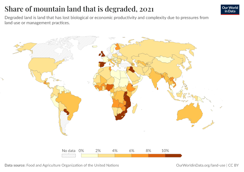 Food and Agriculture Organization of the United Nations – processed by Our World in Data. “Share of mountain land that is degraded” [dataset]. Food and Agriculture Organization of the United Nations, “Food and Agriculture Organization of the United Nations (FAO), South African National Biodiversity Institute (SANBI), Instituto Brasileiro de Geografia e Estatística (IBGE)” [original data]. Retrieved March 12, 2026 from https://who-mortality-db.owid.pages.dev:8789/20260304-094028/grapher/share-of-mountain-land-that-is-degraded.html (archived on March 4, 2026).