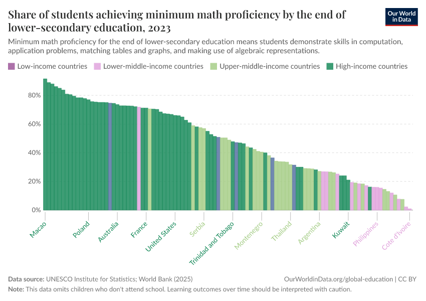 “Data Page: Share of students achieving minimum math proficiency by the end of lower-secondary education”. Our World in Data (2026). Data adapted from UNESCO Institute for Statistics. Retrieved from https://who-mortality-db.owid.pages.dev:8789/20260304-094028/grapher/share-of-students-at-end-of-lower-secondary-education-achieving-minimum-math-proficiency.html [online resource] (archived on March 4, 2026).How to cite this data