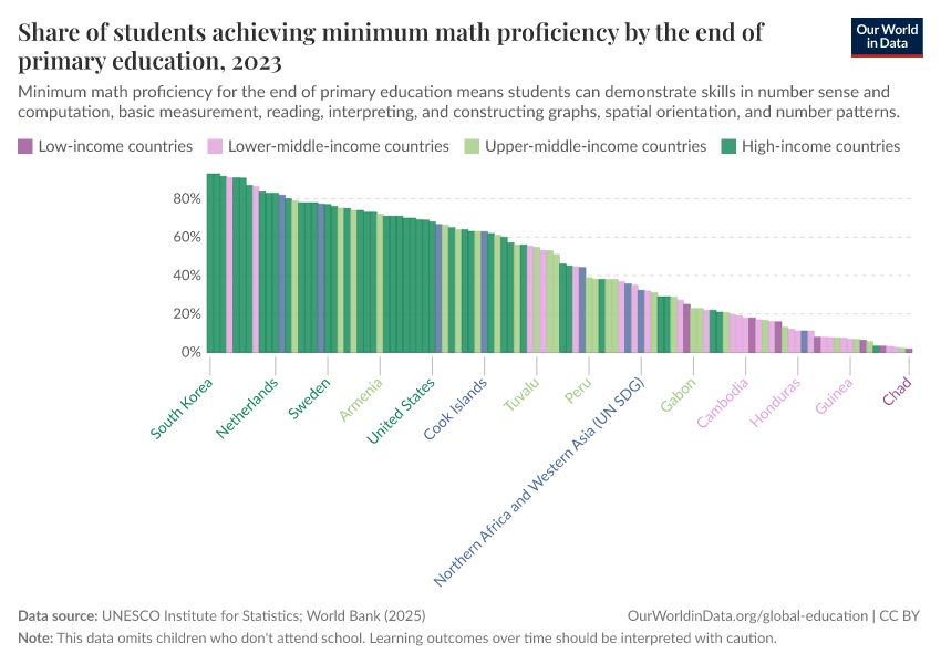 UNESCO Institute for Statistics – processed by Our World in Data. “Share of students achieving minimum math proficiency by the end of primary education” [dataset]. UNESCO Institute for Statistics, “Data from multiple sources” [original data]. Retrieved March 12, 2026 from https://who-mortality-db.owid.pages.dev:8789/20260304-094028/grapher/share-of-students-at-end-of-primary-education-achieving-minimum-math-proficiency.html (archived on March 4, 2026).