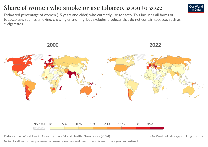 “Data Page: Share of women who smoke or use tobacco”, part of the following publication: Hannah Ritchie and Max Roser (2023) - “Smoking”. Data adapted from World Health Organization. Retrieved from https://who-mortality-db.owid.pages.dev:8789/20260304-094028/grapher/share-of-women-who-are-smoking.html [online resource] (archived on March 4, 2026).How to cite this data
