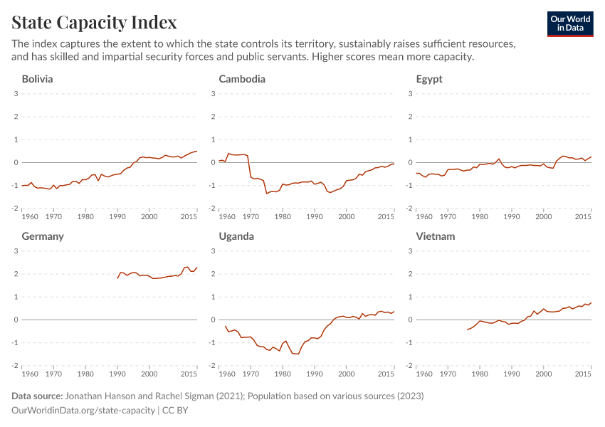 “Data Page: State Capacity Index”, part of the following publication: Bastian Herre and Pablo Arriagada (2023) - “State Capacity”. Data adapted from Jonathan Hanson and Rachel Sigman, Various sources. Retrieved from https://who-mortality-db.owid.pages.dev:8789/20260304-094028/grapher/state-capacity-index.html [online resource] (archived on March 4, 2026).