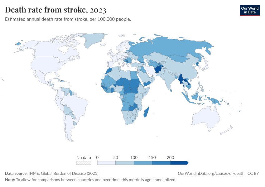 IHME, Global Burden of Disease (2025) – with major processing by Our World in Data. “Death rate from stroke” [dataset]. IHME, Global Burden of Disease, “Global Burden of Disease - Deaths” [original data]. Retrieved March 12, 2026 from https://who-mortality-db.owid.pages.dev:8789/20260304-094028/grapher/stroke-death-rates.html (archived on March 4, 2026).
