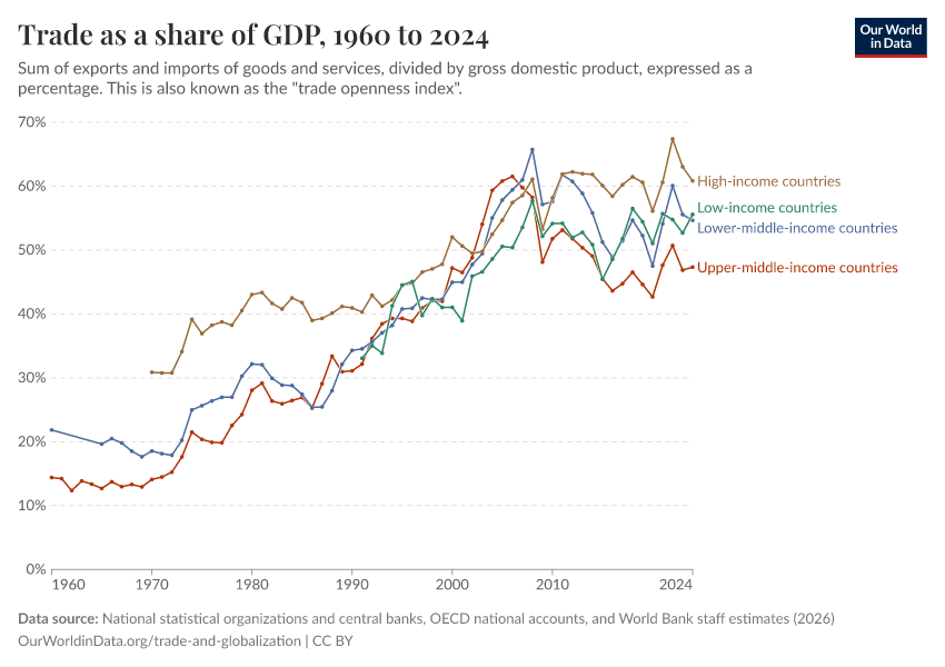 “Data Page: Trade as a share of GDP”, part of the following publication: Esteban Ortiz-Ospina, Bertha Rohenkohl, Veronika Samborska, Simon Van Teutem, Diana Beltekian, and Max Roser (2018) - “Trade and Globalization”. Data adapted from National statistical organizations and central banks, OECD national accounts, and World Bank staff estimates. Retrieved from https://who-mortality-db.owid.pages.dev:8789/20260304-094028/grapher/trade-as-share-of-gdp.html [online resource] (archived on March 4, 2026).How to cite this data