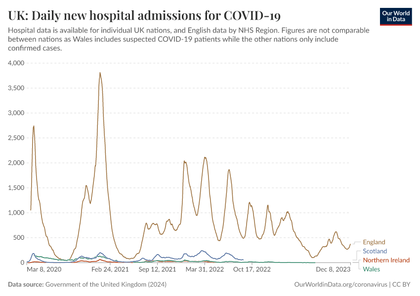Government of the United Kingdom (2024) – with minor processing by Our World in Data. “UK: Daily new hospital admissions for COVID-19” [dataset]. Government of the United Kingdom, “UKHSA data dashboard” [original data]. Retrieved March 12, 2026 from https://who-mortality-db.owid.pages.dev:8789/20260304-094028/grapher/uk-daily-covid-admissions.html (archived on March 4, 2026).