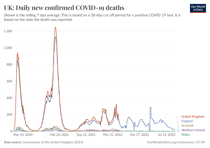 Government of the United Kingdom (2024) – with minor processing by Our World in Data. “UK: Daily new confirmed COVID-19 deaths” [dataset]. Government of the United Kingdom, “UKHSA data dashboard” [original data]. Retrieved March 12, 2026 from https://who-mortality-db.owid.pages.dev:8789/20260304-094028/grapher/uk-daily-covid-deaths.html (archived on March 4, 2026).