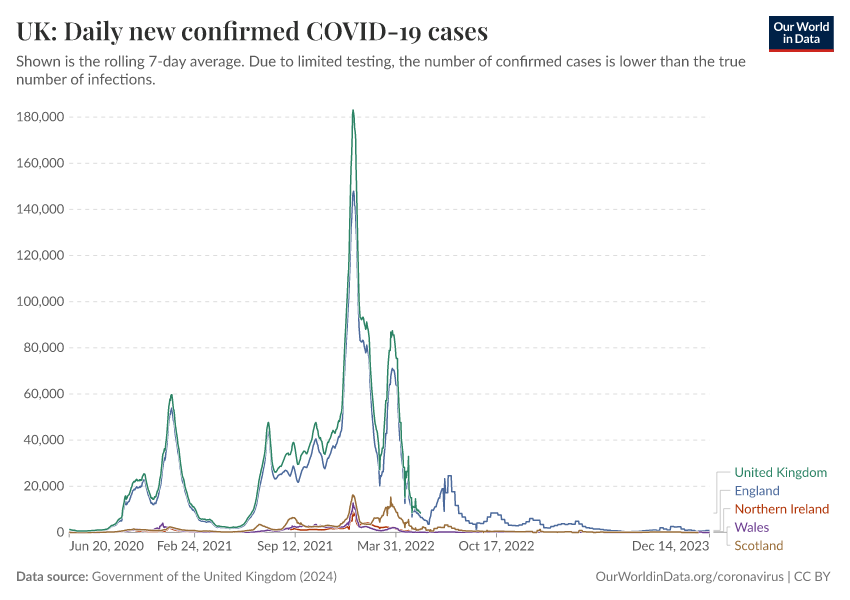 Government of the United Kingdom (2024) – with minor processing by Our World in Data. “UK: Daily new confirmed COVID-19 cases” [dataset]. Government of the United Kingdom, “UKHSA data dashboard” [original data]. Retrieved March 12, 2026 from https://who-mortality-db.owid.pages.dev:8789/20260304-094028/grapher/uk-daily-new-covid-cases.html (archived on March 4, 2026).
