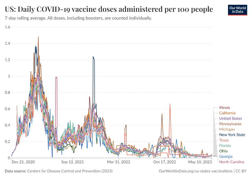 Centers for Disease Control and Prevention (2023) – processed by Our World in Data. “US: Daily COVID-19 vaccine doses administered per 100 people” [dataset]. Centers for Disease Control and Prevention, “COVID-19, Vaccinations (United States)” [original data]. Retrieved March 12, 2026 from https://who-mortality-db.owid.pages.dev:8789/20260304-094028/grapher/us-daily-covid-vaccine-doses-per-100.html (archived on March 4, 2026).