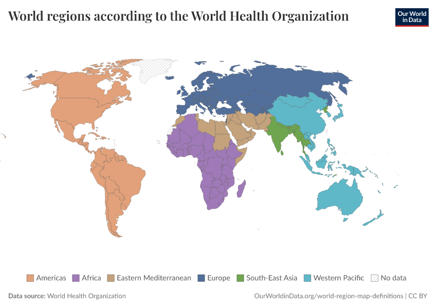 “Data Page: World regions according to the World Health Organization”. Our World in Data (2026). Data adapted from World Health Organization. Retrieved from https://who-mortality-db.owid.pages.dev:8789/20260304-094028/grapher/who-regions.html [online resource] (archived on March 4, 2026).How to cite this data