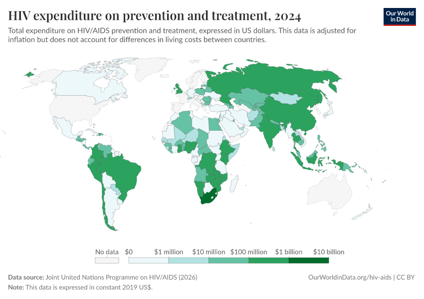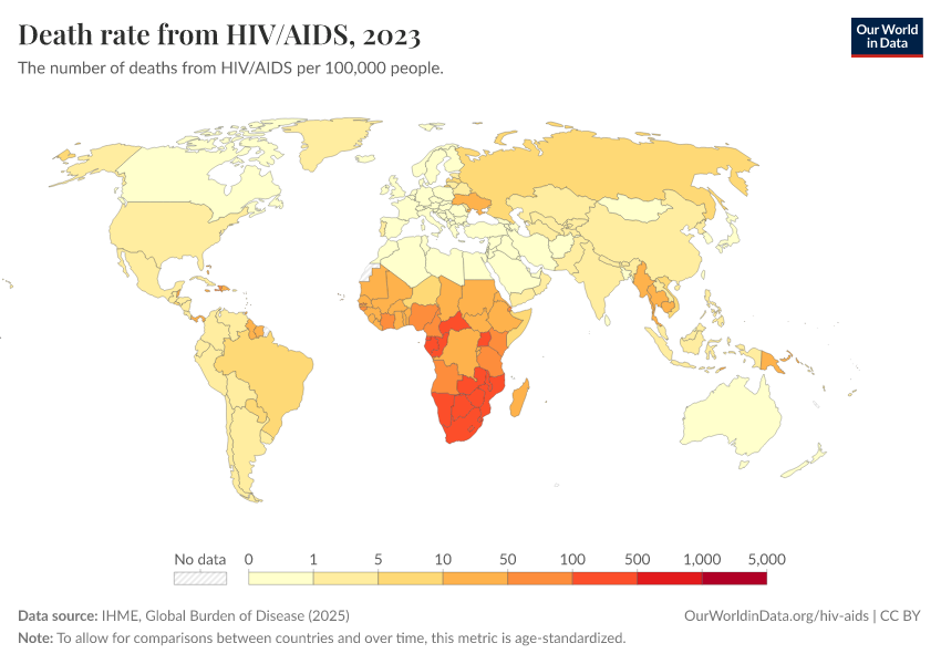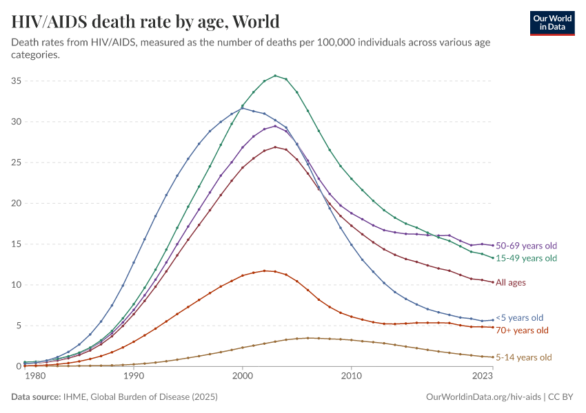 Max Roser and Hannah Ritchie (2023) - “HIV / AIDS” Published online at OurWorldinData.org. Retrieved from: 'https://who-mortality-db.owid.pages.dev/hiv-aids' [Online Resource]BibTeX citation