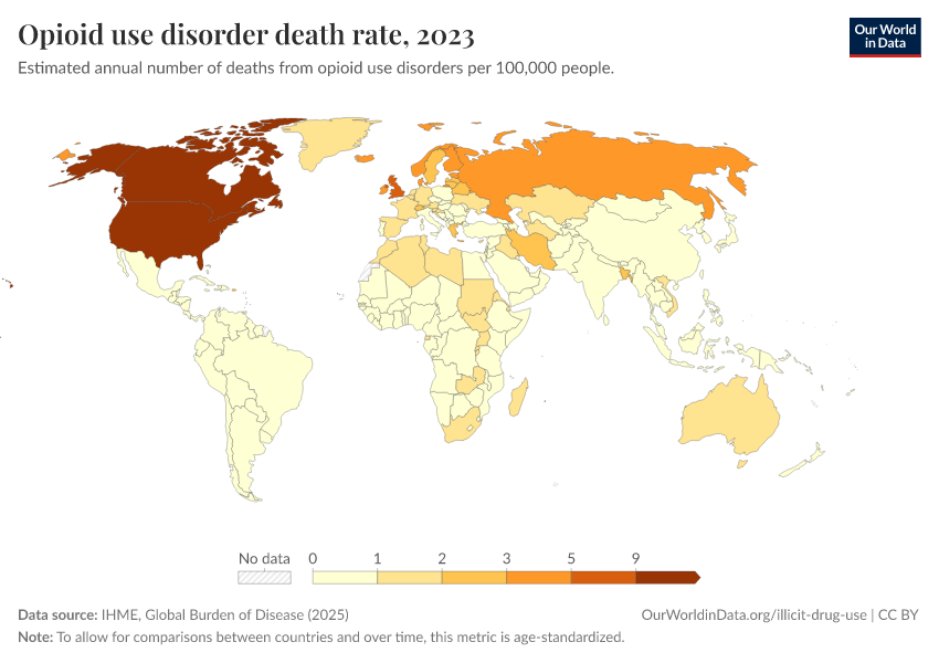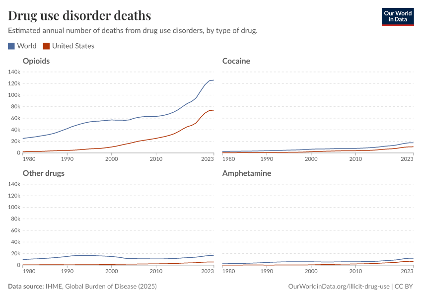 Hannah Ritchie, Pablo Arriagada, and Max Roser (2022) - “Opioids, Cocaine, Cannabis, and Other Illicit Drugs” Published online at OurWorldinData.org. Retrieved from: 'https://who-mortality-db.owid.pages.dev/illicit-drug-use' [Online Resource]BibTeX citation