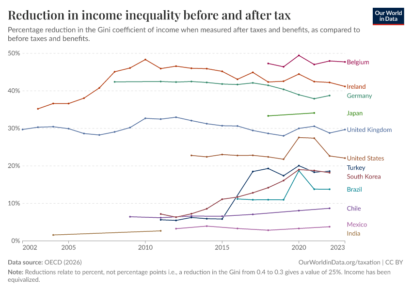 Joe Hasell (2023) - “Income inequality before and after taxes: how much do countries redistribute income?” Published online at OurWorldinData.org. Retrieved from: 'https://who-mortality-db.owid.pages.dev:8789/20260304-094028/income-inequality-before-and-after-taxes.html' [Online Resource] (archived on March 4, 2026).BibTeX citation