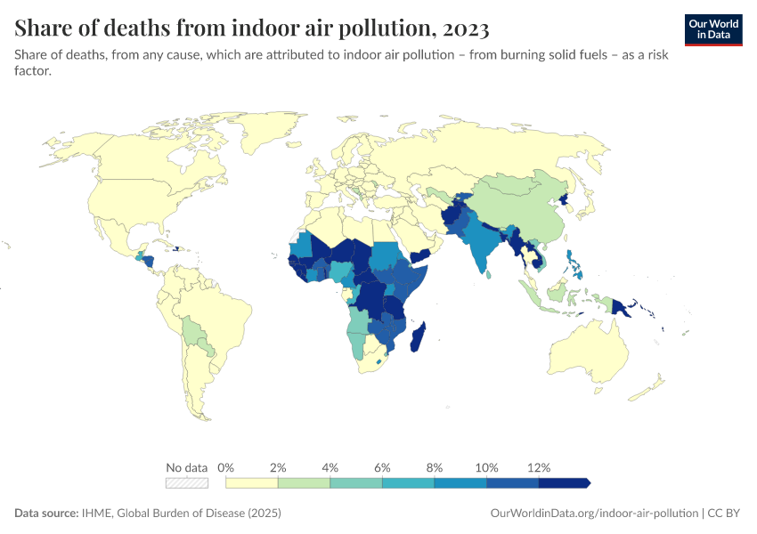 This is based on the share of deaths that are attributable to indoor air pollution based on the impact of air pollution on the risk of diseases like cardiovascular disease, lung disease, lung cancer, and others. In other words, it is an estimate of the share of all deaths that would be prevented if indoor air pollution was absent.
