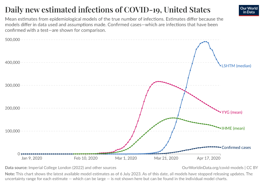 The chart below compares the number of confirmed cases to different estimates of the true number of infections.