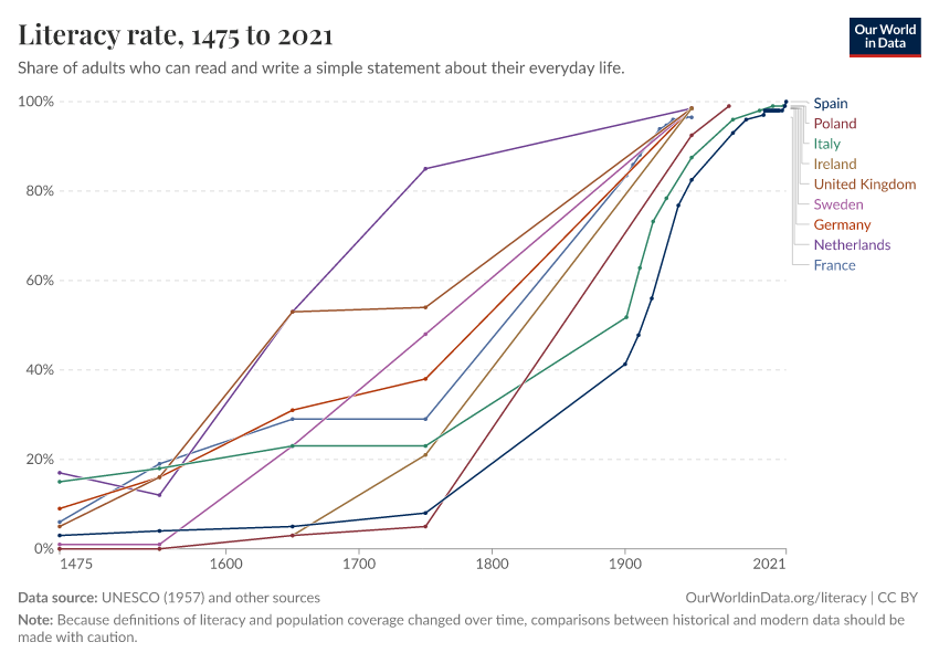 In many countries, more than 95% have basic literacy skills. Literacy skills of the majority of the population are a modern achievement as we show below.