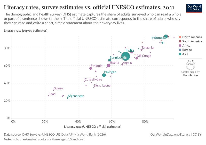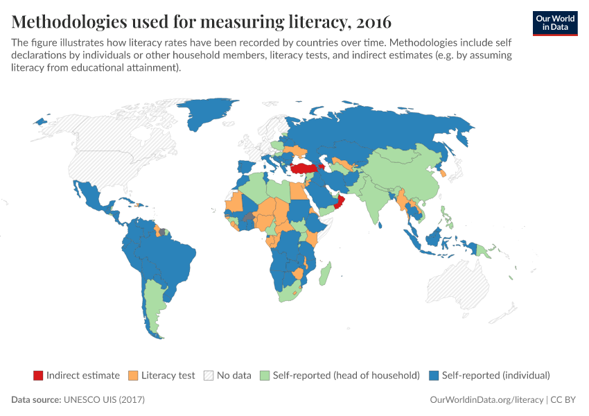 In the chart, we present a breakdown of UNESCO literacy estimates, showing the main methodologies used and how these have changed over time. (To explore changes across time, use the slider underneath the map.)