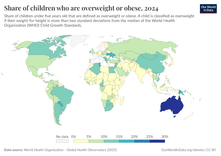 Weight categories are defined by comparing weight to the WHO Growth Standards — a child is defined as overweight if their weight-for-height is more than two standard deviations from the median of the WHO Child Growth Standards.4