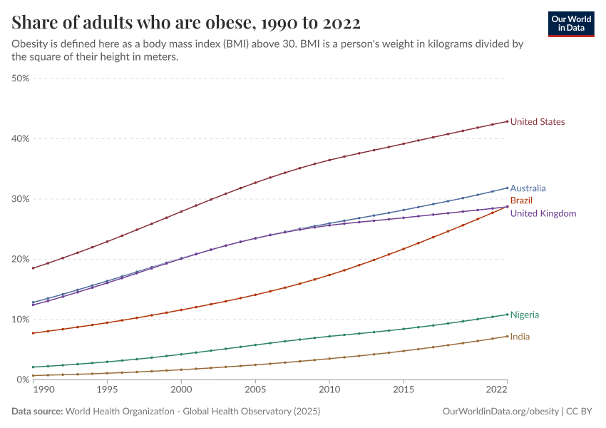 On this page, you will find global data and research on obesity — its prevalence, drivers, health consequences, and trends over time.