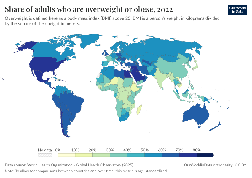 In the map here we see the share of adults who are overweight or obese across countries.