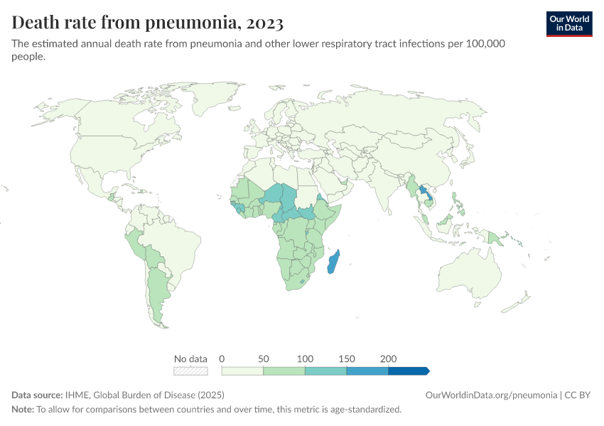 As you can see, the difference between death rates in different world regions is very large. The death rate from pneumonia is highest in sub-Saharan Africa and South East Asia, and much lower in Europe and North America.