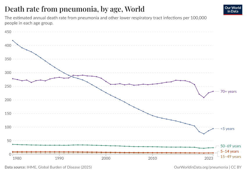 Bernadeta Dadonaite and Max Roser (2019) - “Pneumonia” Published online at OurWorldinData.org. Retrieved from: 'https://who-mortality-db.owid.pages.dev/pneumonia' [Online Resource]BibTeX citation