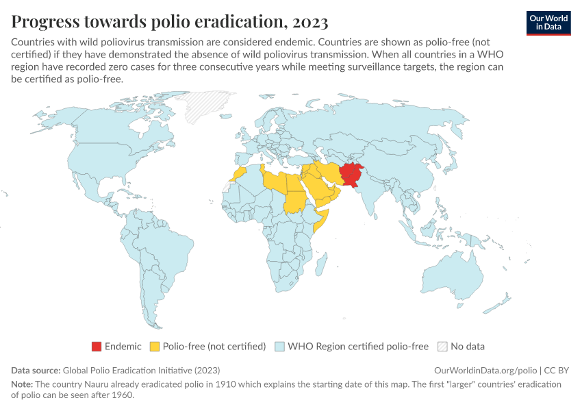 See: Grassly, N. (2013). The final stages of the global eradication of poliomyelitis. Philosophical Transactions Of The Royal Society B: Biological Sciences, 368(1623), 20120140-20120140. Freely available online here.